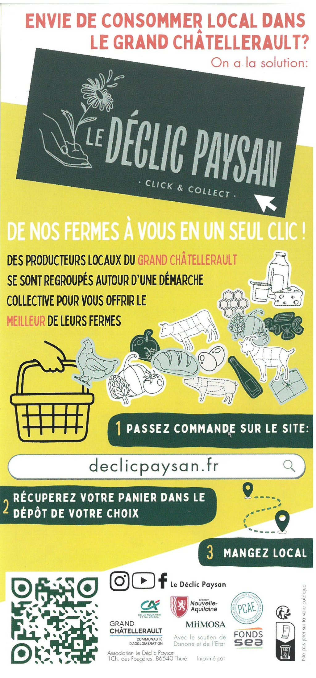 đ Avec Le DĂ©clic Paysan, câest simple : vous commandez en ligne vos produits frais (fruits, lĂ©gumes, pain, viande, Ćufs, miel, etc.) et vous retirez votre panier dans lâun des dĂ©pĂŽts partenaires du Grand ChĂątellerault.