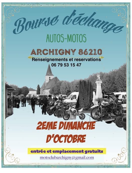 Le club de moto Les PĂ©daches organise sa traditionnelle bourse dâĂ©change ce dimanche 12 octobre 2025, de 7h Ă 18h, sur la place du Bourg dâArchigny.